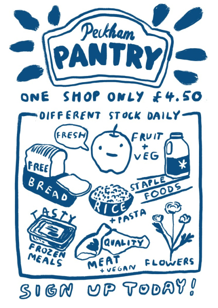 Promotional tea towel for the amazing Peckham Pantry. All profits go to Pecan. Blue screen print on white tea towel.